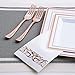 VALUE PACK FOR 50 GUESTS: The 350 pieces clear plastic plates with rose gold trim disposable dinnerware set includes 50 forks, 50 spoons, 50 knives, 50 rose gold dinner plates, 50 rose gold plastic dessert plates, 50 9oz cups, 50 linen like napkins.
