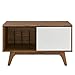 SUPERIOR CONSTRUCTION - Sitting atop tapered legs, this retro media stand features a particleboard frame with walnut grain laminate, and white lacquered full-extension glide drawers for extra storage