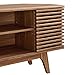 WOOD TV STAND - Sitting atop tapered legs, this contemporary media console features a particle board frame with walnut grain veneer and slatted sliding doors that partially conceal two shelving units