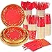SERVES 20 GUESTS: This Red and Gold Birthday Sets has all you need for 20 guests, includes 20pcs 9” Dinner Paper Plates, 20pcs 7'' dessert Plates, 20pcs paper Napkins, 20pcs paper cups ,20pcs forks, 20pcs spoons, 20pcs knives.
