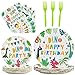 🐘HIGH QUALITY & UNIQUE DESIGN: Designed with colorful dinosaurs, decorated with leaf, balloons, Dino letter, etc., vivid color, and eye-catching pattern; dinosaur party supplies kit all plates, napkins are made from recyclable heavy duty paper, 100% non-toxic, eco-friendly, sturdy and not easy to tear