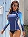 This long-sleeved rashgurad swim shirt has crew neck, bra padded without underwire, front zipper can easy on/off. Unique color block print will help you stand out from the crowd.