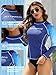 Two Piece Rash Guard Women: This crew neck long sleeve swim shirt features green palm leaf prints and blue. Raglan sleeve with color block design makes it more flattering and stylish.
