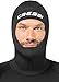 The thickness is 7 mm on the cranium and 5 mm skin-in neoprene for the face and neck. Face area left unbound to allow for custom trimming.
