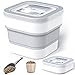 PREMIUM MATERIAL: Collapsible dog food container with measuring cup and scoop made of high quality polypropylene plastic, which is durable, food grade and environmentally-friendly. The folding part is made of TPR material, it has good toughness and can be folded repeatedly.