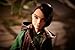 Her signature hairstyle, drop earrings and a microphone accessory complete her look.
