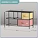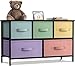 KID FRIENDLY DESIGN — Sleek wide storage — Made with strong steel frame and durable MDF wood top with smooth black finish — Drawers made of breathable, non-woven fabric — Pastel colors in aqua teal, yellow, purple, peach — Wipe clean — Minimal assembly required — Hardware and instructions INCLUDED — Measures approximately 39.50” L x 11.87” W x 24.62” H