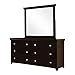 Square, dark espresso encased mirror sits sturdily on durable, solid wood and wood veneer constructed dresser