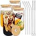 【𝗖𝗟𝗔𝗦𝗦𝗜𝗖 𝗚𝗟𝗔𝗦𝗦𝗘𝗦 𝗦𝗘𝗧】- The glass cups with lids and straws includes 4 can-shaped drinking glasses [ Diameter - 2.6 inches, Height - 5.8 inches ], 4 natural bamboo lids, 4 reusable glass straws and 2 cleaning brushes, 16oz perfect size, very practical. You can also make your own DIY bottle to make it the most personalized gift.