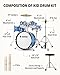🔷JUNIOR DRUM SET FOR KIDS:The 3-drum kit for beginners consisting of 16 inch x 10 inch bass drum, 10 inch x 5 inch snare drum and 8 inch x 6 inch tom drum. The drum is made of horizontally poplar, with high strength, uniform vibration and bright sound.The snare drum has the independent drum stand up.