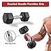 Rubber Hexagon Shaped with Rubber Grip Handle - Rubber hexagon shaped head prevent rolling, protect your floor and keep the dumbbells stay in place; the rubber grip with depth knurling contoured handle provides essential grip and security during use.