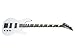 Finish: It comes in a vivid Gloss Black finish with white body binding featuring a parchment pickguard, pearloid sharkfin inlays, chrome hardware including the bridge pickup cover, black skirt-style control knobs, and Jackson pointed 4-in-line black headstock