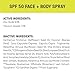 SPF 50 BROAD-SPECTRUM PROTECTION: With active ingredients of non-nano zinc oxide and titanium dioxide, our Face + Body Spray SPF 50 provides UVA-UVB true broad-spectrum coverage