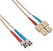 The cable has a pair of color-coded ST connectors on one end and a Dual SC connector on the other end with 5 μm core and 125 μm cladding diameter