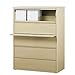 Lateral file features a roll-out binder storage/posting shelf and five drawers with hanging file