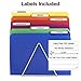 Set of 24: Includes 4 each of Red, Green, Blue, Yellow, Orange, Magenta folders, equal numbers of left right and middle tabs, 24 removable adhesive labels that leave no residue.