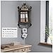 Antique wooden wall mounted shelf with organization hooks and rustic torched wood finish