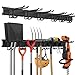 【Adjustable Rubber-coated Double Layer Hooks】The garden tool organizer have 6 pcs double layer hooks. Each long hook is 10 inches, shorter hook is which can hold multiple tools. The hooks are rubber-coated (protect your tools from slid and damage) and removable, you can customize the spacing between the attachments on the 48" steel rail (3 panels) to meet your needs.