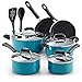 CONVENIENCE AND CONTROL: The 12-piece nonstick cookware set boasts dual-riveted rubberized stainless steel handles and shatter-resistant glass lids; includes slotted turner and spoon