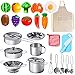 🎀 COMPLETE TOY KITCHEN ACCESSORIES - Total 28 pieces include: 14 piece stainless steel set (a whisk, ladle, spatula, slotted spoon, spaghetti server), pans with Lid and Handles, 12 cutting vegetables toys, and 1 piece chef apron & potholders.