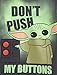 Screen print design of The Child, who looks like an adorable Baby Yoda, with black puff ink on eyes, nose & mouth and the words "don't push my buttons"
