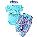 Cute newborn girl clothes: bule ruffle romper with "Daddy's Girl Mommy's World"word design, mermaid pants, matching bowknot headband, super fashionable 3pcs baby clothes for girls in Spring Summer Fall.