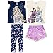 Officially licensed Disney Frozen little girls 4 piece mix n’ match clothing set: cute and stylish short sleeve graphic tee shirt, sleeveless tank top, dolphin shorts, and leggings