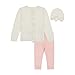 STYLISH FROM TOP TO BOTTOM: Laura Ashley's charming set of baby girl clothes is inclusive of a ruffled, button-down baby cardigan, striped infant girl leggings, and a pretty baby bonnet with a bow; all pre-matched so you can stay on top of the trend!