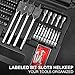 [Premium Handles with Markings]: Ergonomically designed to fit comfortably in hand, provide leverage with finger slots, prevent rolling when set down, and ensure an anti-slip performance with grip textured rubber. Drivers and bit carriers are labeled with screwdriver type and size for quick identification, improving efficiency at work