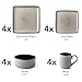 WHAT’S IN THE BOX: Service for 4 that contains 4 of each of the following: 10.4" Dinner Plates, 7.75" Dessert Plates, 5.75" Cereal Bowls and 14.8 OZ Mugs