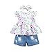 Features:ruffle short sleeve,back button design ,beautiful flower print,ripped denim short pants,your baby girl summer gift.