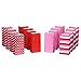 Package of 16 lunch bags in a multi-design gift bag set. Includes 4 red bags, 4 pink bags, 4 red bags with pink and white hearts and 4 pink red and white stripe bags.