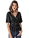 Features: Solid color, flowy short sleeve, split v neckline, swiss dot fabric, no lined, front and back pleated design, summer tunic shirt, breathable, loose fit, fashion dressy casual blouse, pull on closure.