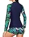 Two Piece Rash Guard Women: This crew neck long sleeve swim shirt features green palm leaf prints and blue. Raglan sleeve with color block design makes it more flattering and stylish.