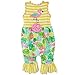 AnnLoren Tropical Summer Flamingo Romper. Features Yellow Stripes and Flamingo and Palm tree print. Pink Flamingo embroidered applique. Sleeveless romper with snap closures behind neckline and crotch. Pink Polka Dot Rose applique at the waist. Finished with gathered yellow Striped ruffles at ankles. Made with Soft and Stretchy 95% Egyptian Cotton 5% Spandex Knit. Machine Washable.