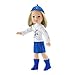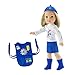 FEATURE DESCRIPTION: 14-inch doll clothes outfit includes a bright blue pleated doll skirt and socks, matching blue hat with embroidered flower, and amazing long sleeved tee with one of a kind Daisy flower print.