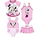 Featuring Minnie Mouse cartoon on one piece bathing suit, "Minnie" swim shirt, and swim top; adorable pink and white polka dot all-over print design swimwear set