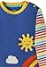 Cute and colorful appliques and embroideries on front, with lots of details, for a happy, fun, childlike design: a smiling sun, a white cloud, and a 4-color rainbow on an intense blue background. Light blue (turquoise) back. Sleeves have rainbow stripes print, with a slight paintbrush effect to make it stand out from mass-market designs