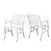 Finely-wrought aluminum metalwork gives this set of twin chairs a unique look unlike any other. More than mere dining chairs, these impart the area with their charm and delicate details. They're great for the garden, patio, front porch, or anywhere else in your home that could use a little dash of elegance
