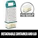 Detachable Container: a detachable container with a removeable lid attaches seamlessly to the bottom of the grater so that you can catch and store ingredients easily; it includes measurements to help you get a precise measurement every time