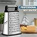 INCREDIBLE VERSATILITY WITH THE 4 SIDED DESIGN: Consider getting rid of all the other graters and slicers you may own to make room for this. Coarse grating, Medium grating, Fine grating/Zester and even a Slicer - all in one convenient tool. Quickly prep an array of foods like cheese, potato, squash, zucchini, carrots, lemons and cucumbers. Multi-functional with a comfortable handle that gives you total control.
