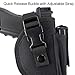 Quick release clasp, Snap-On button and adjustable retaining strap for secure different size handguns.