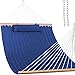 【Quilted Hammock】The double-layered quilted polyester with inner polyester padding and the polyethylene-stuffing head pillow offers you superior comfort. The 55-inch hardwood spreader bar is powder coated in an oil-rubbed finish, making it more stylish and stable. Handcrafted polyester ropes add character and authenticity, and thickness of the end cords contribute greatly to the balance and strength of the hammock.