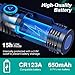 [SUPER BRIGHT LED]: Easily light up an entire room or focus in on objects 300 feet away with an incredibly bright 700 lumens! 15 times brighter than standard LED technology. Powered with 2 CR123 Lithium Batteries (INCLUDED)