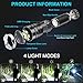 【4 Lighting Modes】Super bright flashlight has 4 light modes: low-medium-high-strobe. Easily switch between different lighting modes at the touch of a button. Meet your different lighting needs. Press and hold the power button for 2-3 seconds to turn off with one button, no need to cycle.