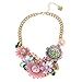 Drama bib necklace featuring bold curb chain and mixed multi-colored flower motif charms at front adorned with glistening stones, lustrous pearls and colorful elements. This whimsical necklace is set in polished gold-tone metal and has an adjustable lobster clasp closure.