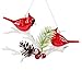 Beautiful duo of cardinals sitting on an icy branch with pinecone and holly berries