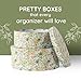 DURABLE CONSTRUCTION: Created using quality paperboard with a matt finish, these elegant oval boxes for organizing are solid and durable. Our cardboard boxes feature a matching all-over floral design. Set includes one of each; Medium storage box with lid: 10.6" x 9.4" x 3.9", large gift box with lid: 12.6" x 10.6" x 5.1".