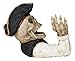 This polyresin drinking pirate wine holder features a detailed pirate skeleton head with shoulder and arm poised to hold 1 inverted wine bottle, offering a quirky and convenient display and storage option for homes and spaces. The pirate skeleton head is designed with a black pirate hat, wearing a white shirt, a black crossed bones skull eye patch, a black jacket and a black body belt.