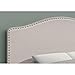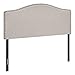 Upholstered arched top headboard in a beige linen-look fabric with chrome-finish nailhead trim